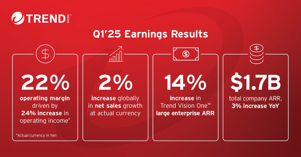 TOKYO, May 8, 2025 /PRNewswire/ -- Trend Micro Incorporated (TYO: 4704;TSE: 4704), the largest global cybersecurity company headquartered outside the U.S., today announced first-quarter 2025 financial earnings, ending March 31, 2025, with total company ARR exceeding U.S. $1.7 Billion, up 3% year-over-year (YoY).