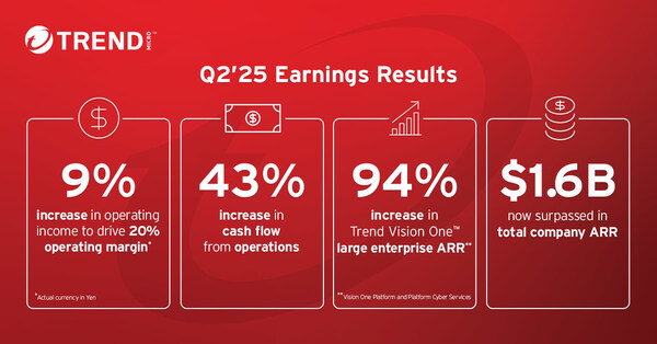 TOKYO, Aug. 7, 2025 /PRNewswire/ -- Trend Micro Incorporated (TYO: 4704;TSE: 4704), the largest global cybersecurity company headquartered outside the U.S., today announced second-quarter 2025 financial earnings, ending, June 30, 2025, with annual reoccurring revenue exceeding U.S. $1.6 Billion, up 1% year-over-year (YoY).