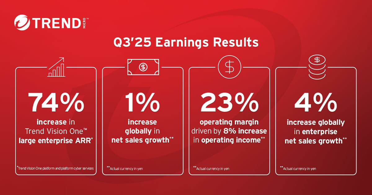 TOKYO, Nov. 12, 2025 /PRNewswire/ -- Trend Micro Incorporated (TYO: 4704;TSE: 4704), the largest global cybersecurity company headquartered outside the U.S., today announced third-quarter 2025 financial earnings, ending September 30, 2025, with annual recurring revenue exceeding U.S. $1.6 Billion, driven by large enterprise ARR up 3% year-over-year (YoY).